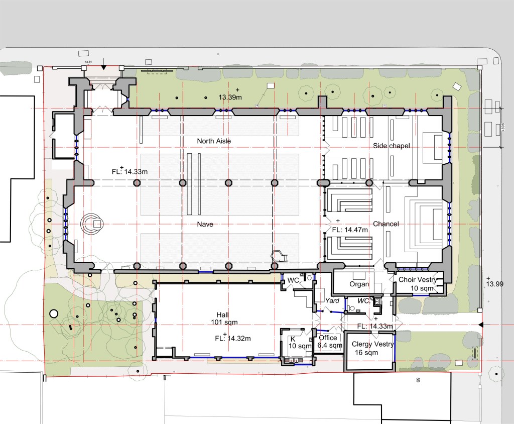 The floor plan below shows the layout of the present church and hall.